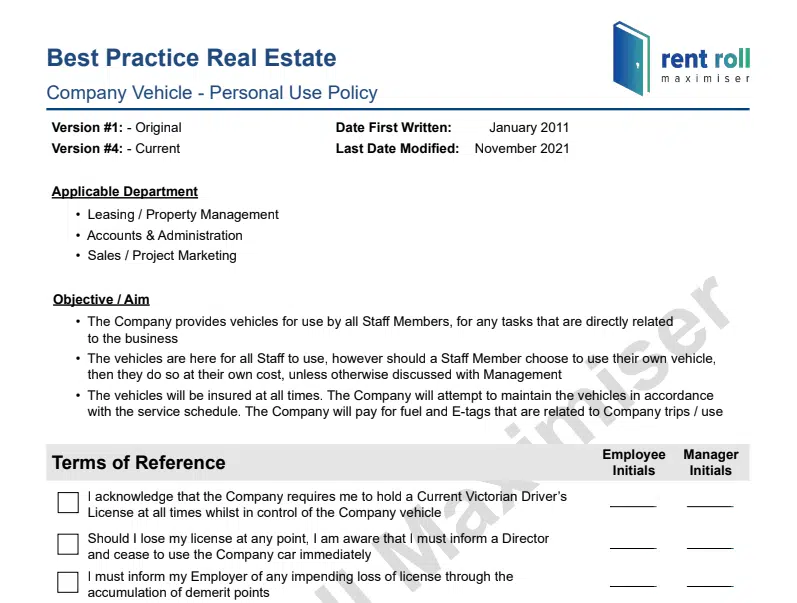 This document includes the terms that an Employee should acknowledge and comply with in order to use a Company vehicle for personal use or office only use